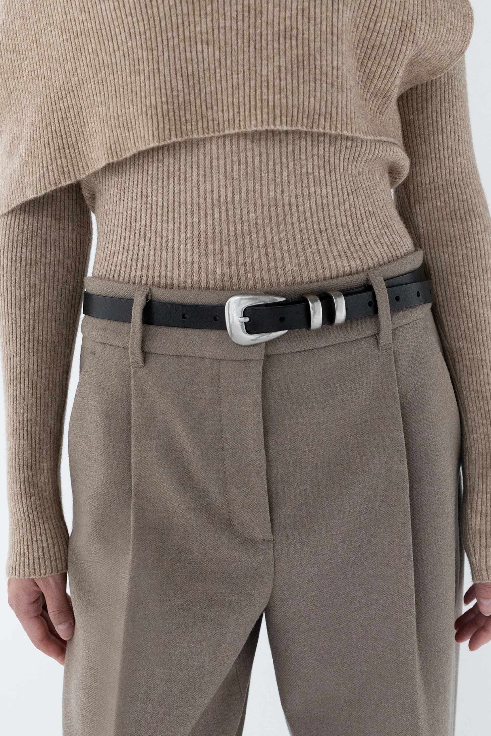 This thin belt features a silver tip with two silver belt loops.
