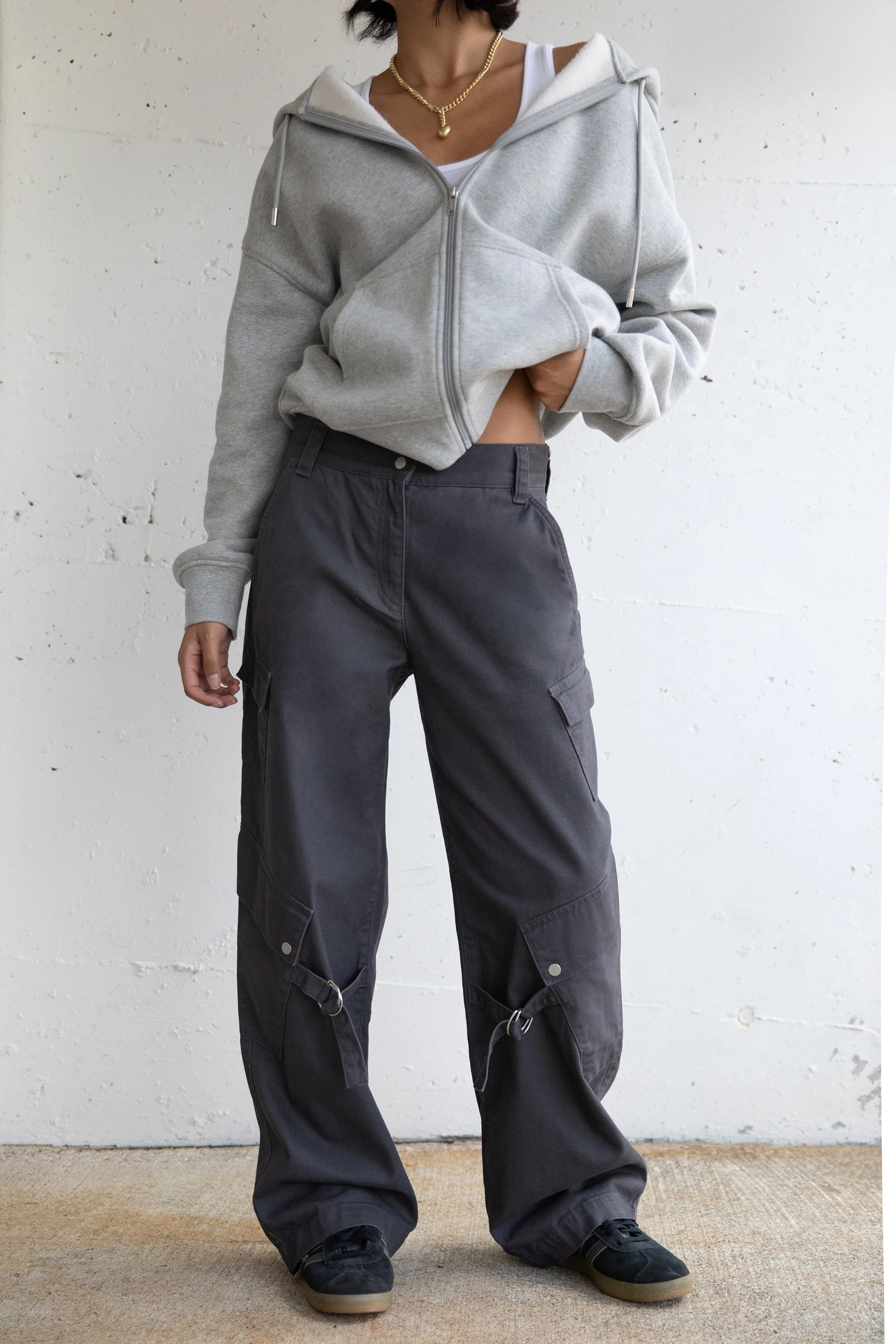 These relaxed fit cargo pants are made in a straight leg cut and has a mid-rise waist. It has slanted cargo pockets, snap waist closures and d-ring details. Wear yours with any tops from knit sweaters to fitted tops.