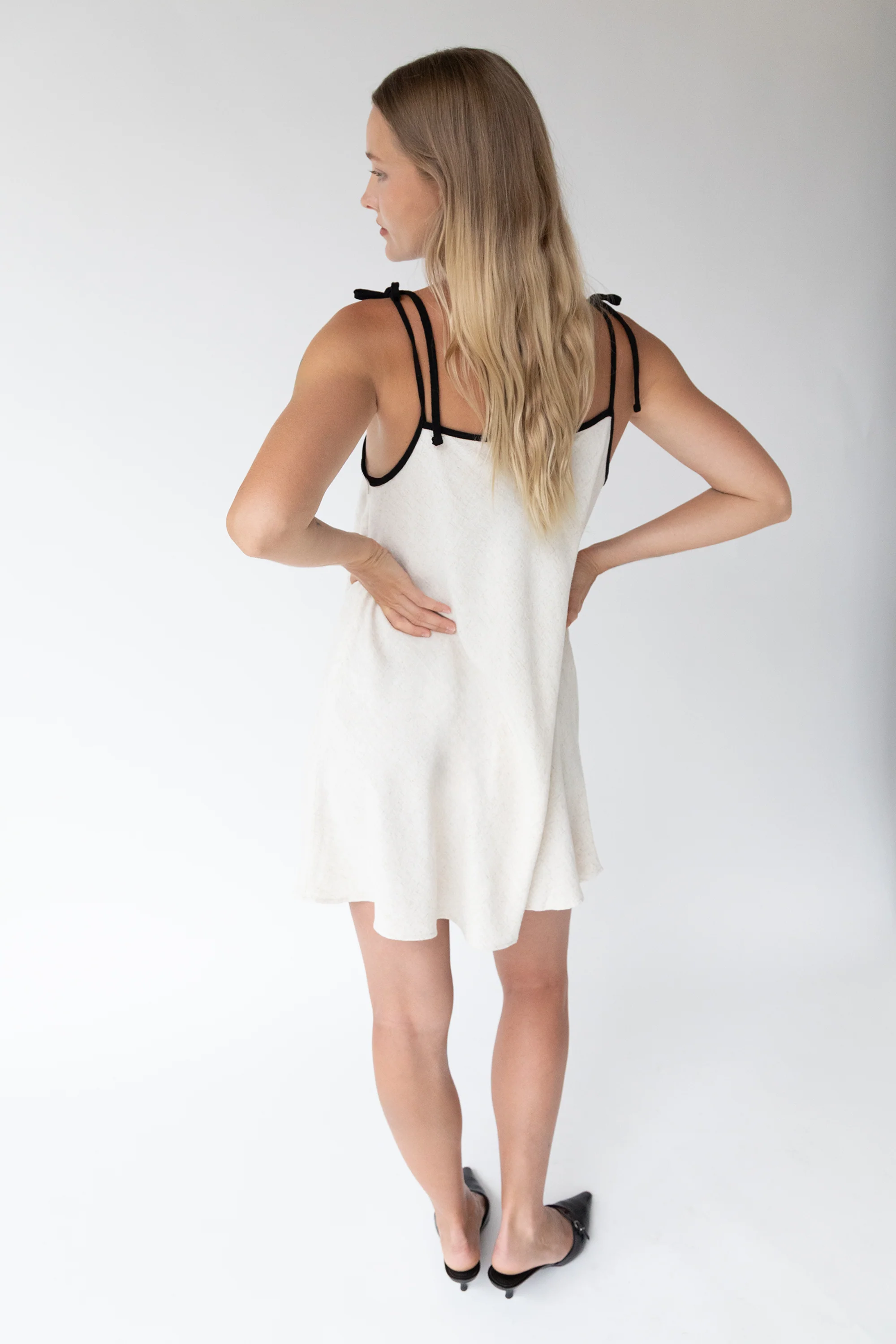 This mini length dress features contrast piping and shoulder ties. Style yours with our strappy pointed mule (FO-13080-W).