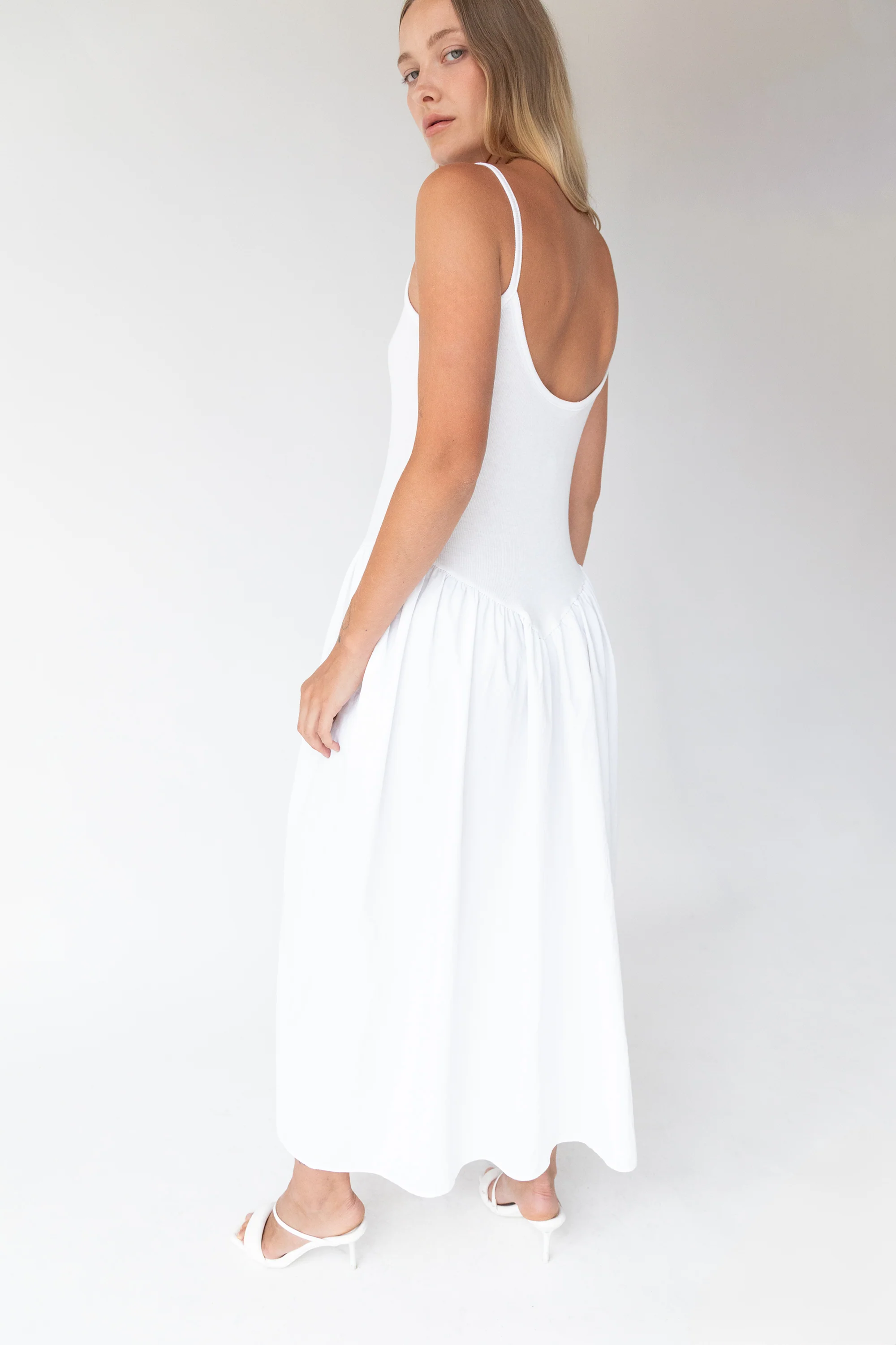 This maxi length dress features a knit top and drop waist nylon skirt. It is super lightweight, which is perfect for hot summer days. Style yours with heels and your favourite small bag.