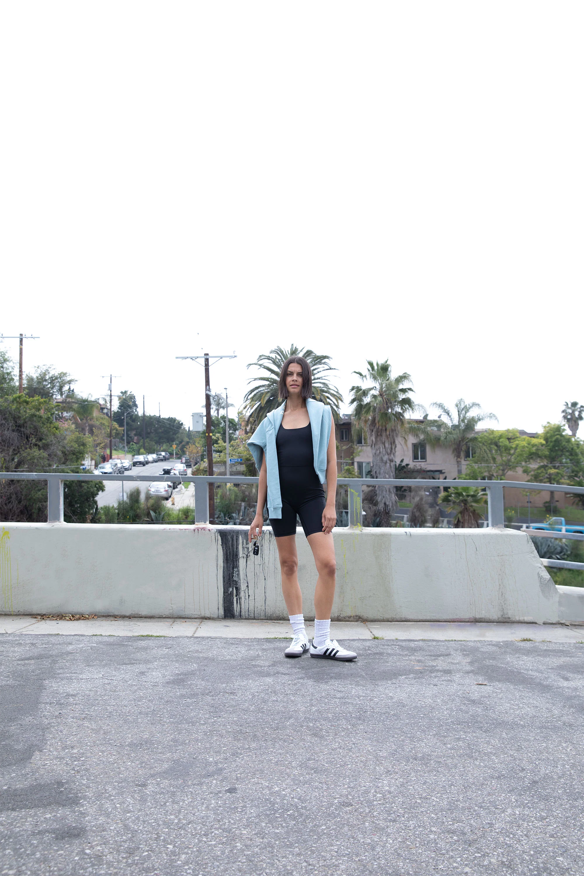 Comfort and function in one, this fitted romper is made from a buttery soft recycled fabric and has a tank bodice and side panel pockets. An easy silhouette to wear for working out or running errands.