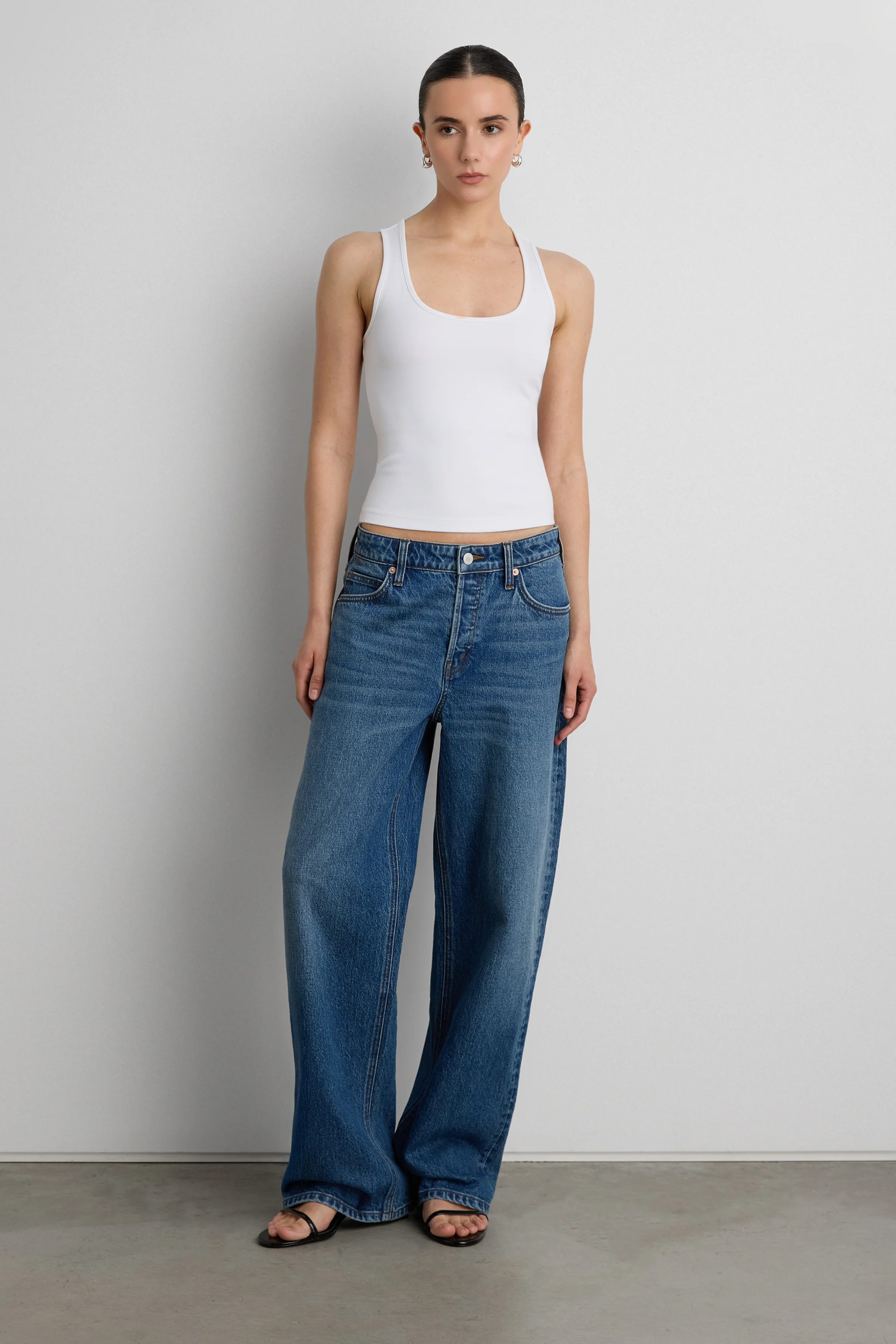 - Model 2 in Dark Medium Wash is 5'7" with a 24" waist and is wearing a size 26